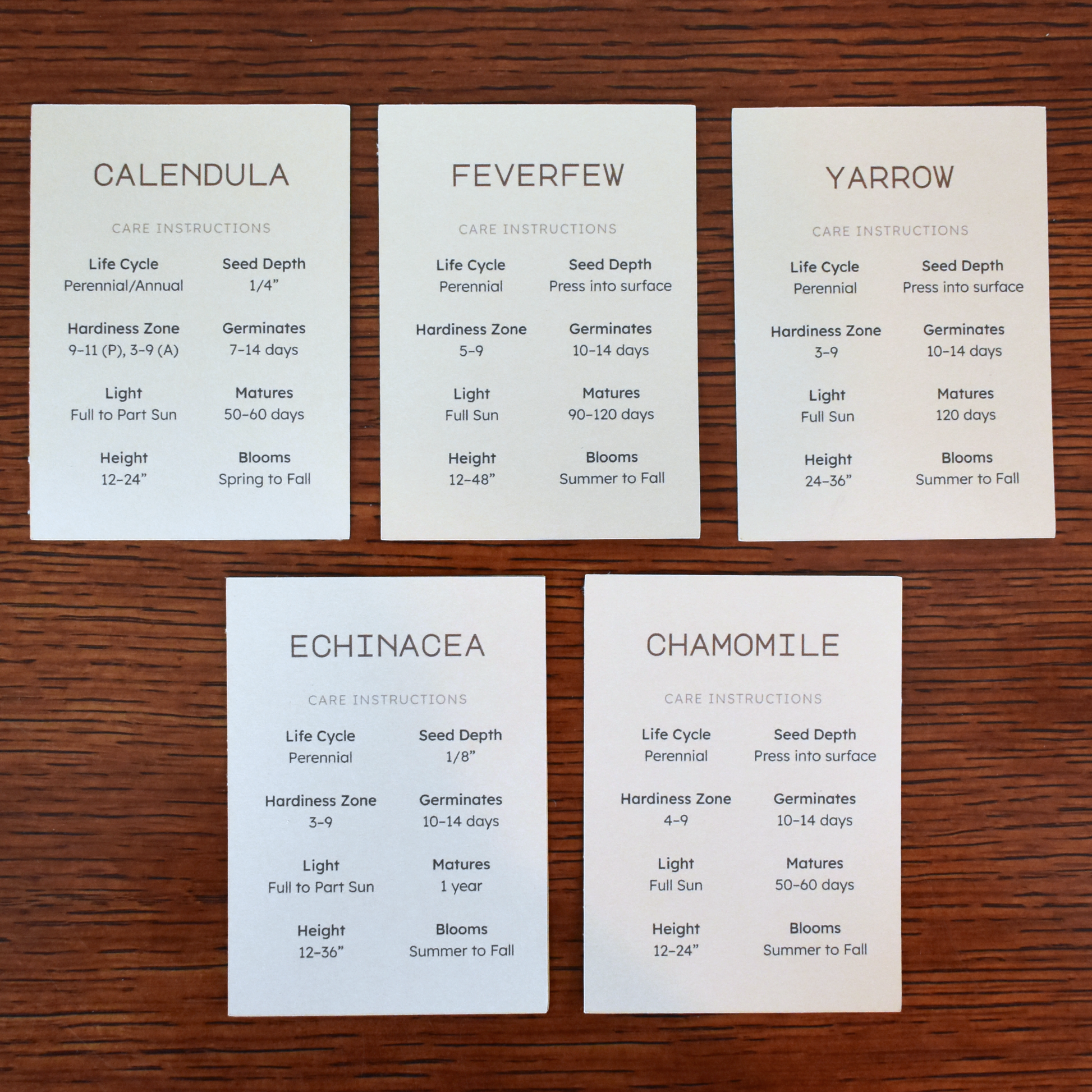 This set of 5 medicinal herb seeds includes Calendula, Feverfew, Yarrow, Echinacea, and Chamomile packaged in a gift box. This would make a great gift for a home gardener interested in growing ingredients for their own natural remedies!